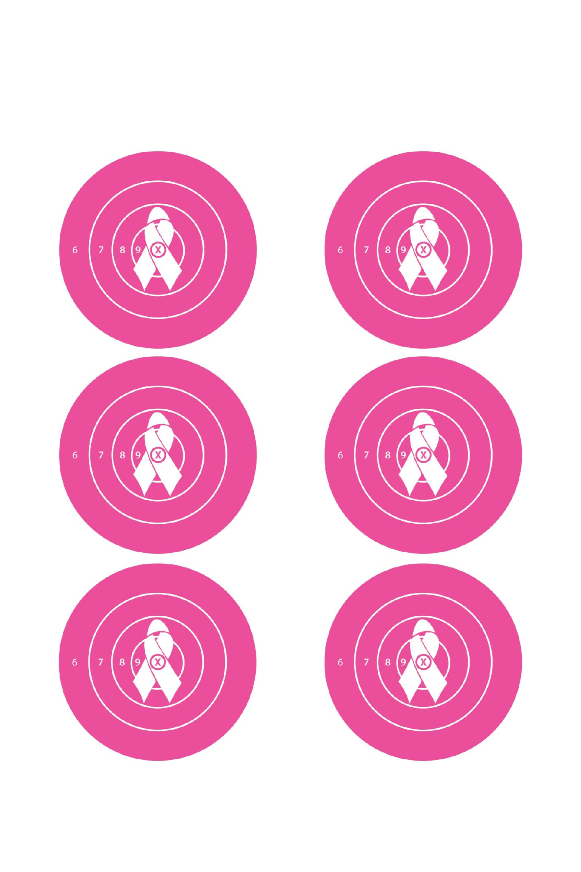 - Six-spot bullseye layout with pink ribbon breast cancer awareness design